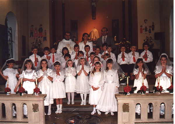 Pictured with Mr Driscoll (The Headmaster), Mrs Roamer (Deputy Head) and Father Michael Cleary are the 1st communicants of 1987 Thanks to Maria (that's her on the far right) we now have a date year of 1987 which was also confirmed by John (back row), and possibly June 23rd. for the actual day - Thanks to Maria & John. |